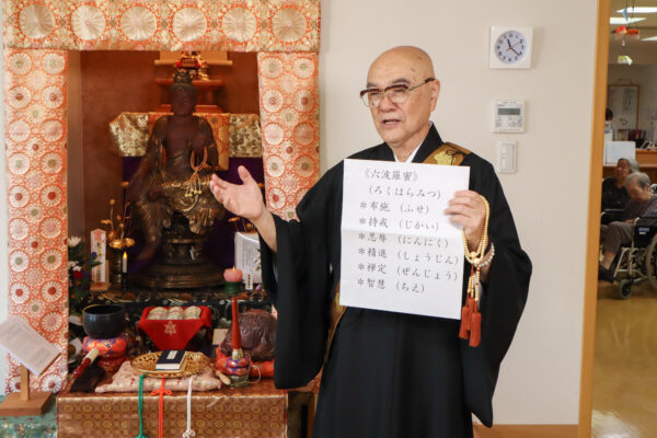 彼岸は7日間ありますが、どうして7日なのかという話をさせて頂きます。中日の一日はご先祖様の供養をする日です。お墓参りに行ったりしますね。あとの6日は、私たちが修行をする6日間なのです。どのような修行かと言いますと、六波羅蜜という六つの修行です。布施(ふせ)・持戒(じかい)・忍辱(にんにく)・精進(しょうじん)・禅定(ぜんじょう)・智慧(ちえ)の六つです。これを一日一つずつ修行するのです。 でも全部修行するのは私たち凡人にはなかなか難しいですね。そこでお勧めするのは「布施」です。布施というのはお寺さんにお金を持っていくことだけではないのです。相手の気持ちを覚(さと)って、自分の持っているものを差し出すことも布施です。お金のある人や物を持っている人はいいですけれど、自分は何も持っていない!どうしよう・・・と思う人もいますよね。大丈夫です‼その時は「和顔施((わがんせ)」というのがあります。皆さん、あいリレーの施設にいて、お隣に座っている人や職員さんに「ありがとう」と心を込めて笑顔を向けてみてください。きっと周りの人たちがみんな笑顔になりますね。幸せを感じますね。これも布施です。お彼岸のこの一週間、日々無事に過ごせることに感謝しながら、ぜひ「和顔施」をやってみてください。